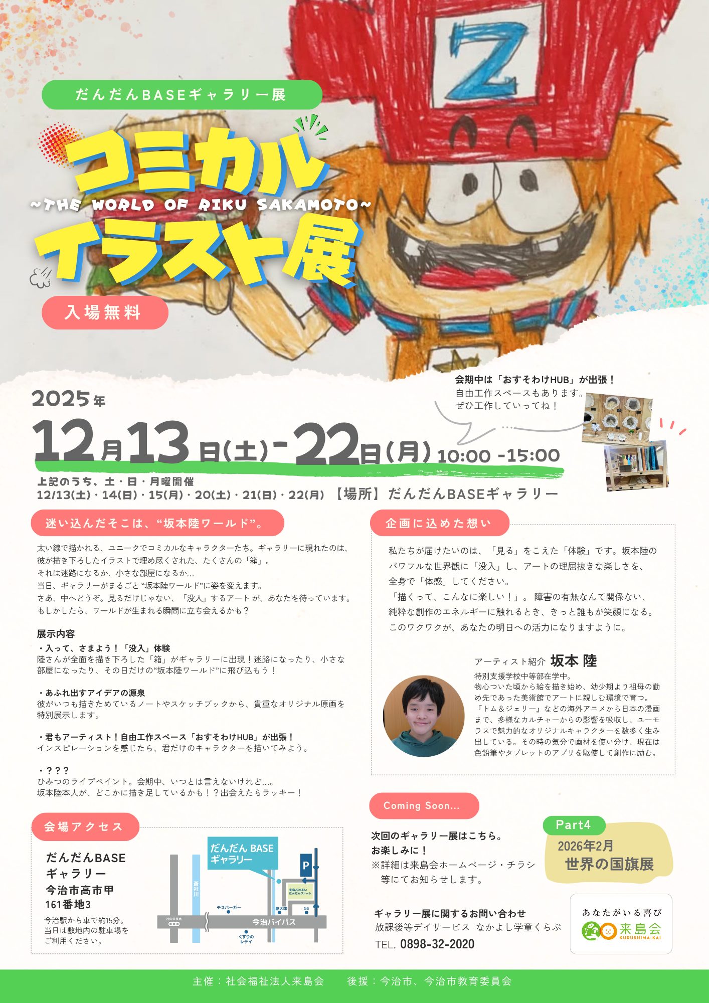 第三弾は、2025年12月13日(土)~22日(月)の期間で、市内中学校1年生・坂本陸さんによる個展『コミカルイラスト展~THE WORLD OF RIKU SAKAMOTO〜』を開催します。会期中は、ギャラリーがまるごと“坂本陸ワールド”に姿を変えます。見るだけじゃない、「没入」するアートが、あなたを待っています。
