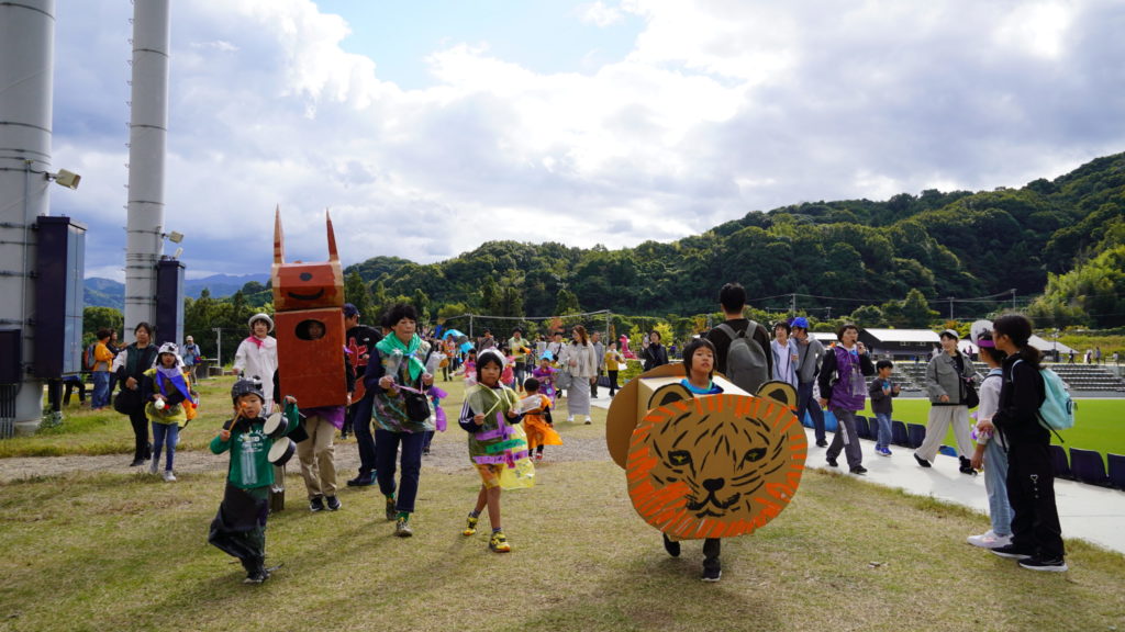 午後からは、参加者全員が自作の衣装と楽器を身につけ、音楽家の片岡祐介さんの生演奏に合わせてパレードを行いました。瀬戸内サーカスファクトリーのアーティストたちも一緒に盛り上げ、里山全体が一体となる時間に。