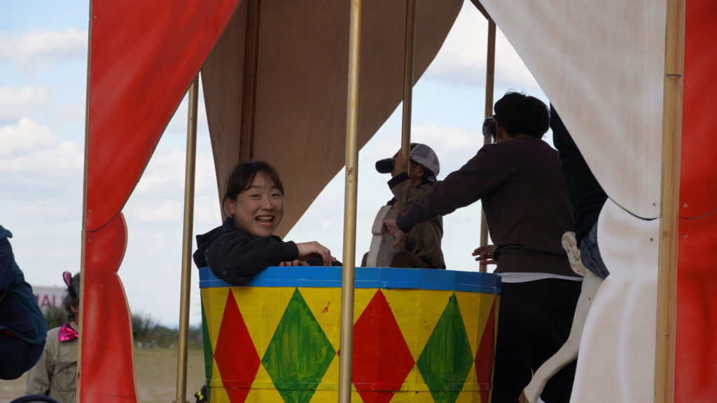 自転車をこぐと馬やカップが回転し、さらに、音楽家の片岡祐介さんが生演奏!「こぐ人」と「乗る人」が互いに入れ替わりながら楽しみを生み出す光景は、誰もが支える側にも支えられる側にもなれる、そんな“もちつもたれつ”の関係性を体感できるものでした。