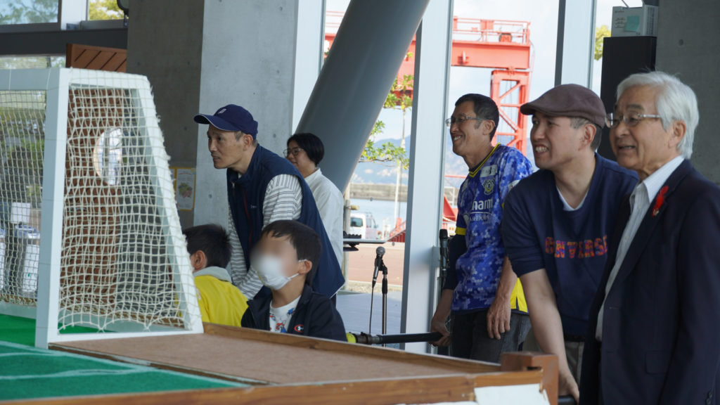 巨大なサッカーボードゲームの前では、大人も子どもも、福祉関係者も地域の人も、みんなが同じ“プレイヤー”です。「がんばれ!」「今のうまい!」「わあ!すごいね」