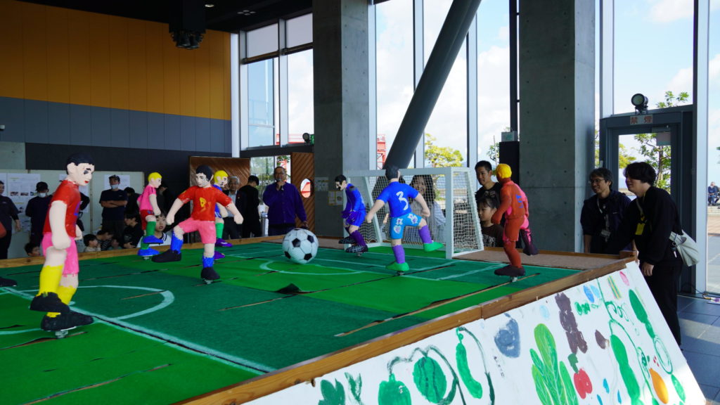 会場に現れたのは、縦6メートル・横3.5メートルの巨大なサッカーボードゲーム。 美術家ユニット KOSUGE1-16が作成したこの作品は、子どもから大人まで、障害の有無を問わず、誰もが同じ空間で楽しめるアート作品です。そこには、競うことよりも「共に楽しむ」ことを通して生まれる交流の風景が広がっていました。