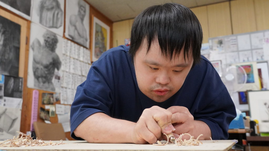 現在は来島会が運営する「多機能型事業所 ふきあげワークス」に通所し、就労と創作活動を両立しています。
