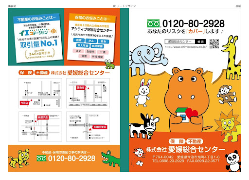デザイン:愛媛総合センターのカバのキャラクターを中心に、井出さんが描いたゾウ、ライオン、キリン、パンダなどの個性豊かな動物たちを優しいタッチで配置