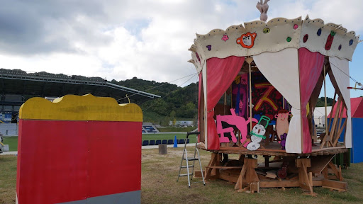 スタジアムのナイター照明付近に、メリーゴーラウンドと子どもたちや障がいのある方の描いた動物のサーカス団が登場。メリーゴーラウンドは自転車をこぐと動きます。